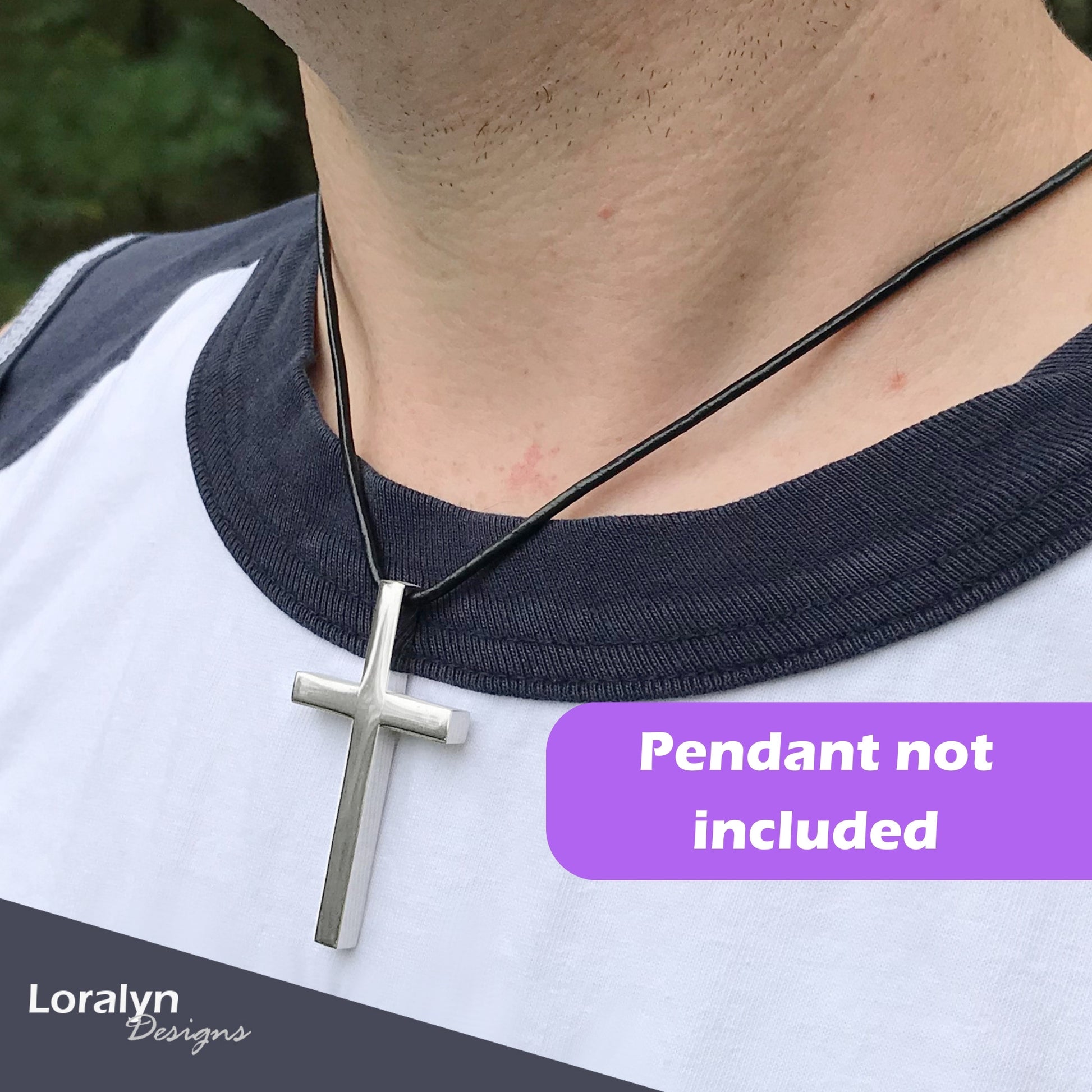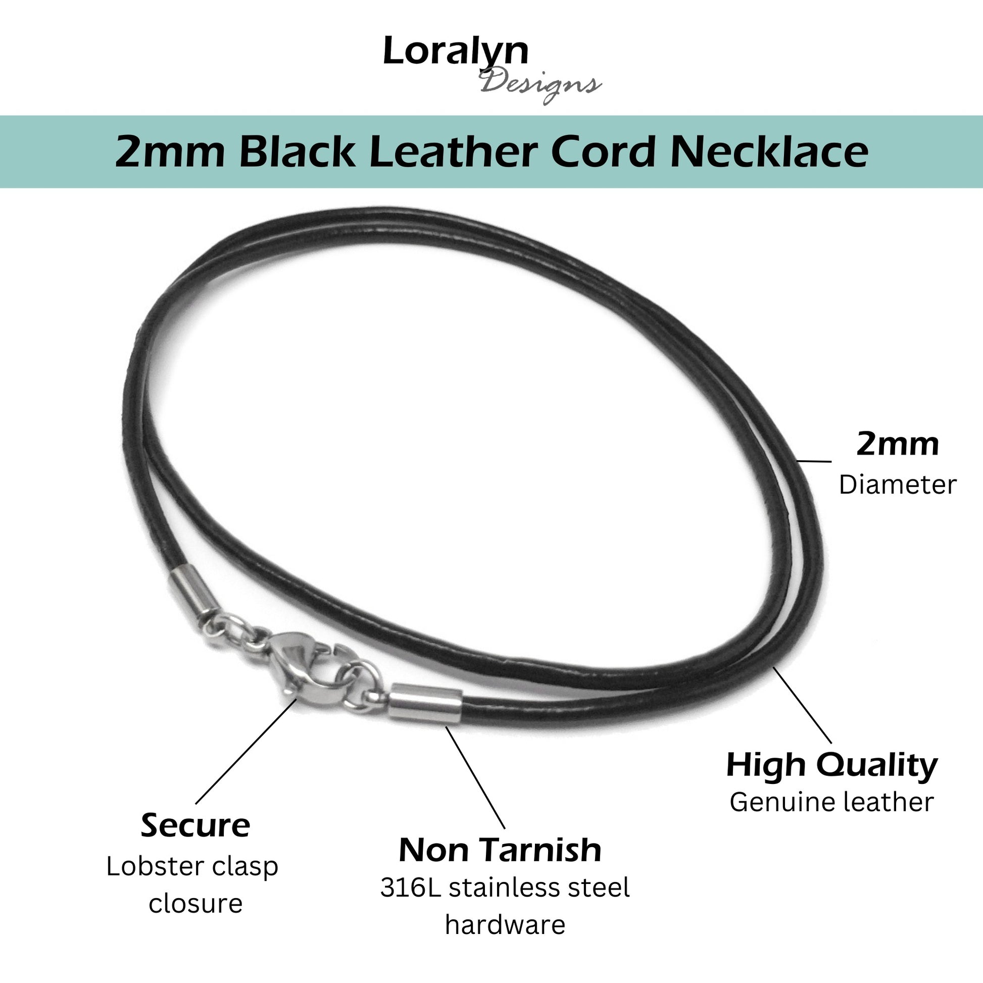High quality round black genuine leather necklace cord with non tarnish, durable stainless steel lobster clasp closure, Measuring 2mm in diameter (thickness of a nickel), this cord would be great for a man or woman. Wear alone or customize with your own pendant. Women typically wear lengths from 16 to 20 inches while men usually choose 20 to 30 inch. Moisture degrades leather so be sure to remove when showering, swimming or working out.