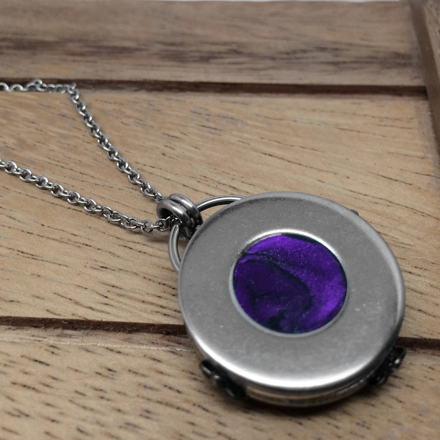 Two necklaces in one!  Feeling fun?  Wear the necklace with the filigree side out with the lavender resin center.  Need simple?  Flip it over to showcase the beautiful dark purple metallic resin.  For your necklace length, choose anywhere from 16 to 24 inches.