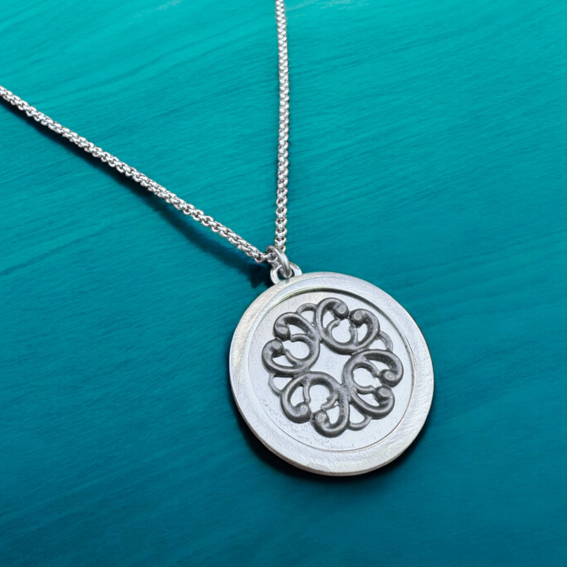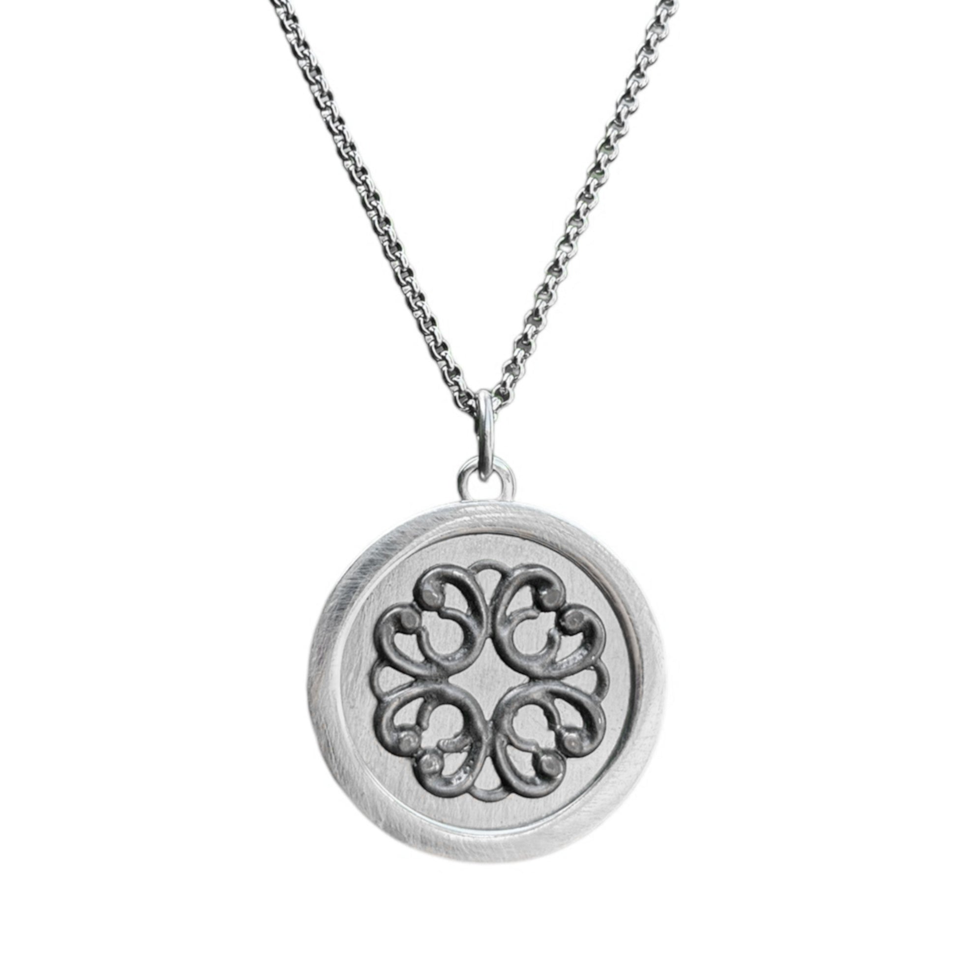 This handmade brushed stainless steel necklace boasts a striking Celtic filigree mandala design. The 1.25-inch pendant showcases a raised, intricate pattern on the front and a sleek, solid stainless steel back. Blending old world inspiration with modern charm, this versatile piece is perfect for both casual and formal outfits. It comes with a 2mm rolo link stainless steel chain in your preferred length (16, 18, 20, 24, or 30 inches) and is secured with a reliable lobster clasp for everyday wear. Crafted from waterproof and tarnish-free stainless steel, this necklace is durable and beautiful. It arrives in a jewelry box with a black velvet lining, making it an excellent gift for any special occasion.