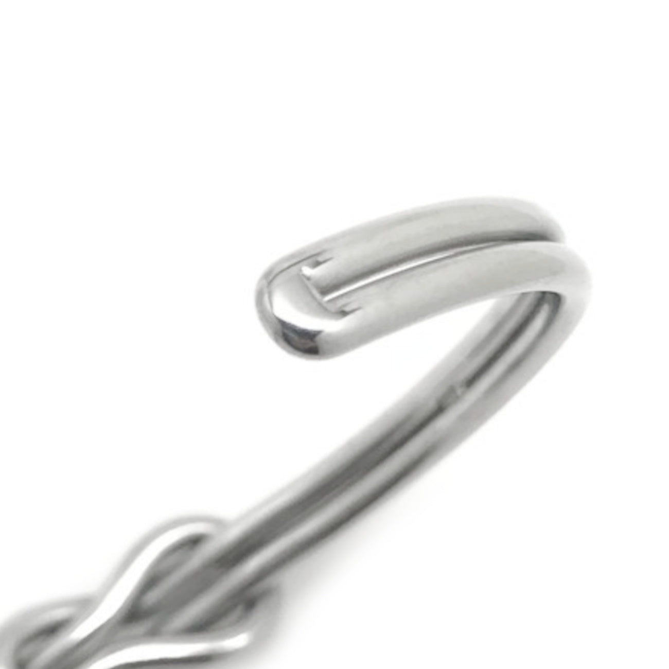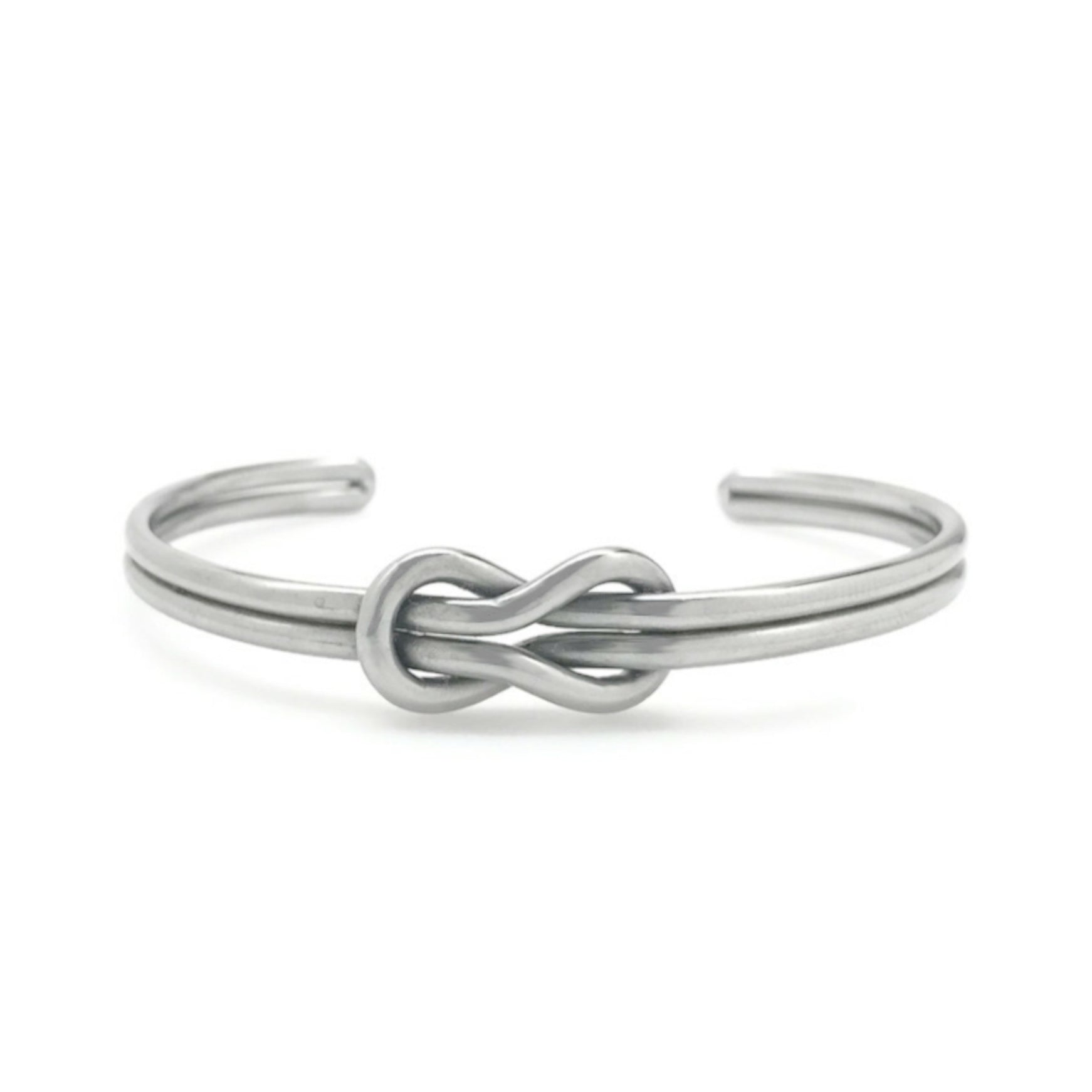 This mirror finish stainless steel round wire cuff bracelet features a simple yet stunning square infinity style love knot design. At its smallest, the bracelet can accommodate a 6 inch wrist and can go as large as you need (Great for large wrists!). The 1/4 inch band is easily adjustable by pulling or pushing together the ends.