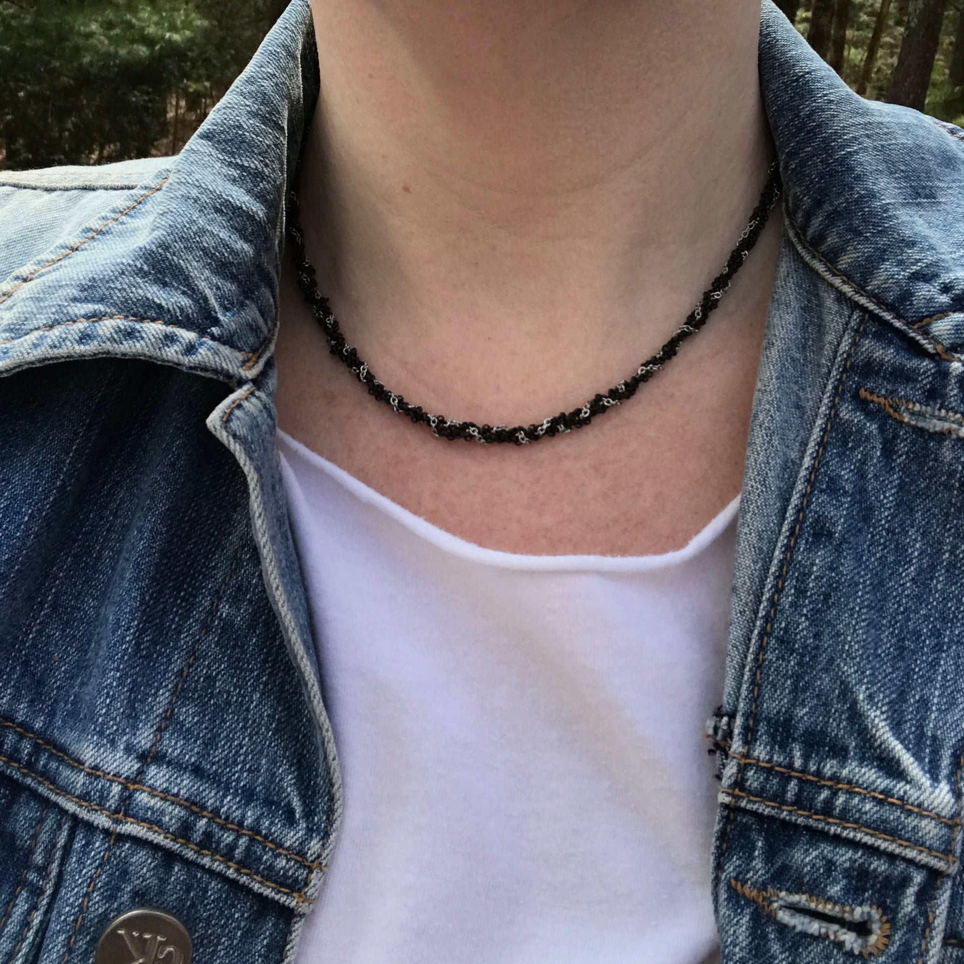 This 5mm wide, handmade rope chain necklace features a combination of black and silver stainless steel chains that are tightly braided together. Stainless steel is an great choice for individuals with skin sensitivity, is waterproof and will not tarnish like sterling silver.