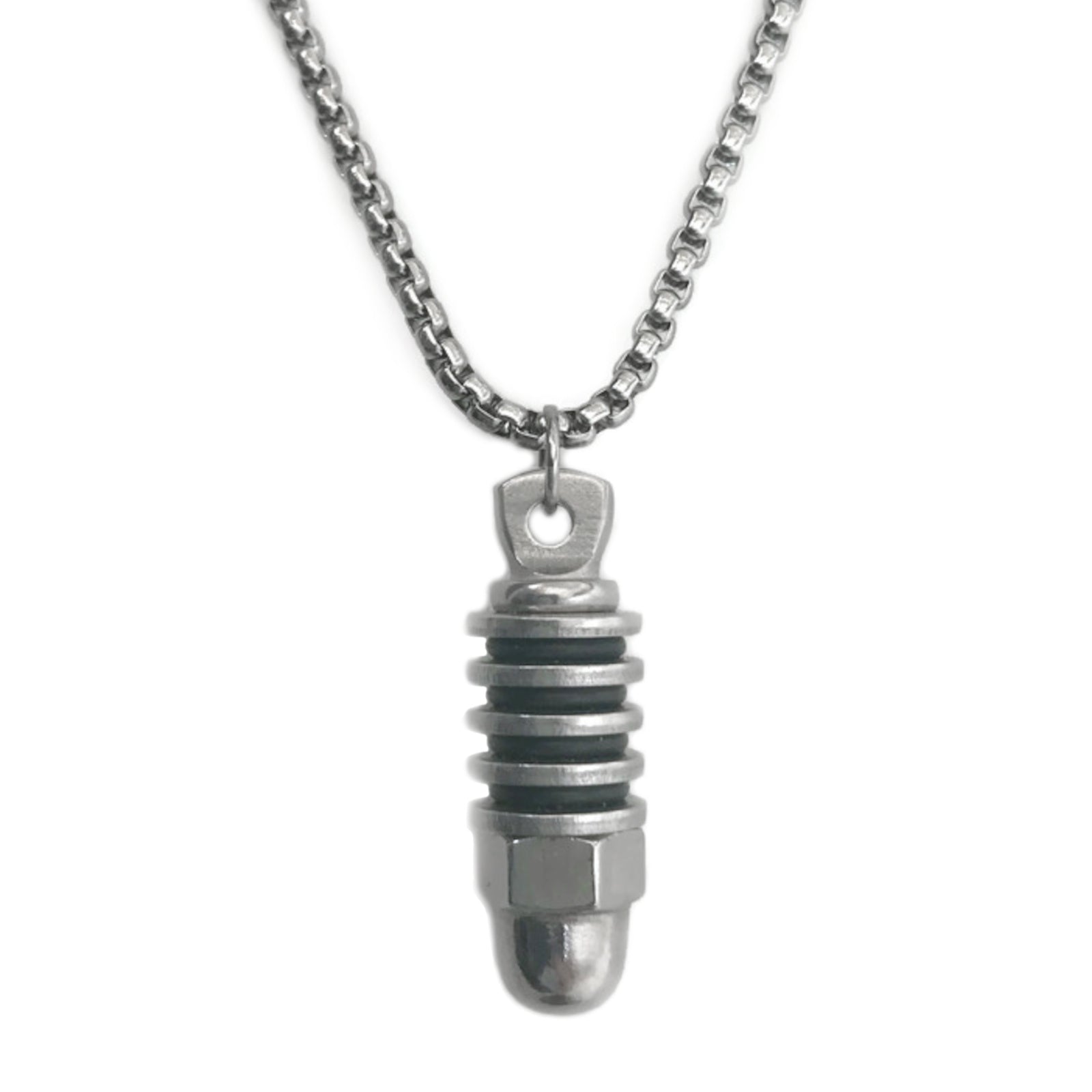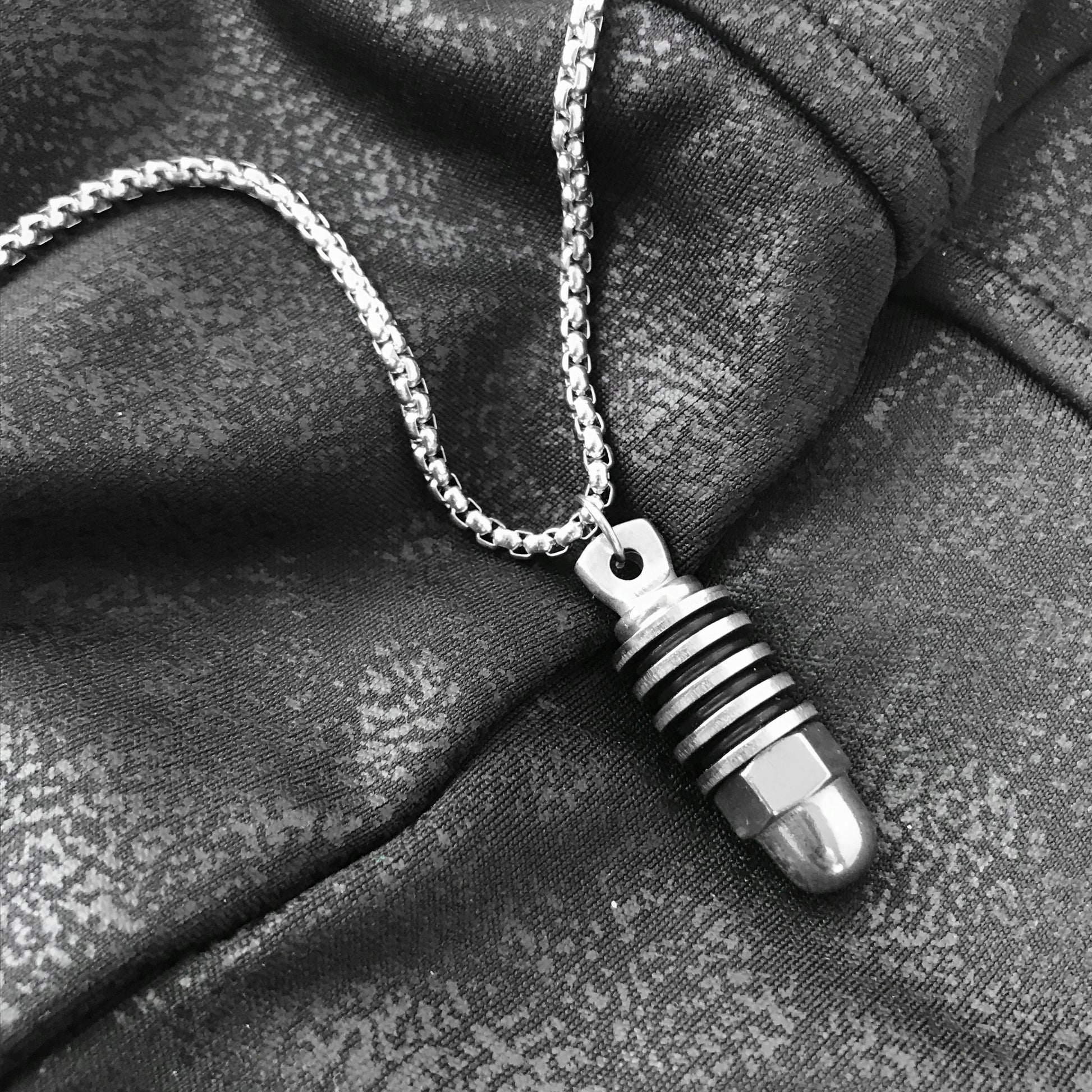 Show off your rugged sense of style with our industrial cylinder necklace! This handmade stainless steel pendant has a modern meets industrial feel and is 1.4 inches tall and 1/2 inch wide. With black rubber detailing and all-weather stainless steel, this bad boy is 100% waterproof and won't tarnish no matter what. Plus it comes with a stainless steel box link chain in your choice of 20" or 24" lengths with lobster clasp closure - it's the perfect accessory to rock your unique look!
