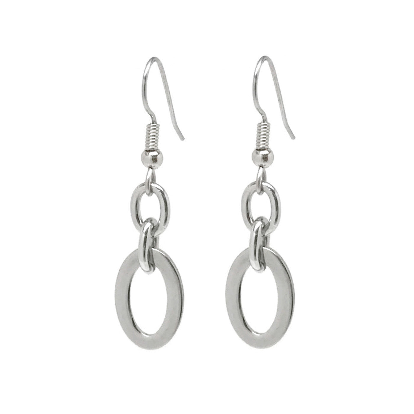Oval shape hypoallergenic dangle earrings polished to a mirror finish. They measure a tad under 1/4 inch in wide and will hang 1 3/4 inches down from your ear piercing. The french hook earring wires are surgical steel so they will not irritate your ears (or turn them green).