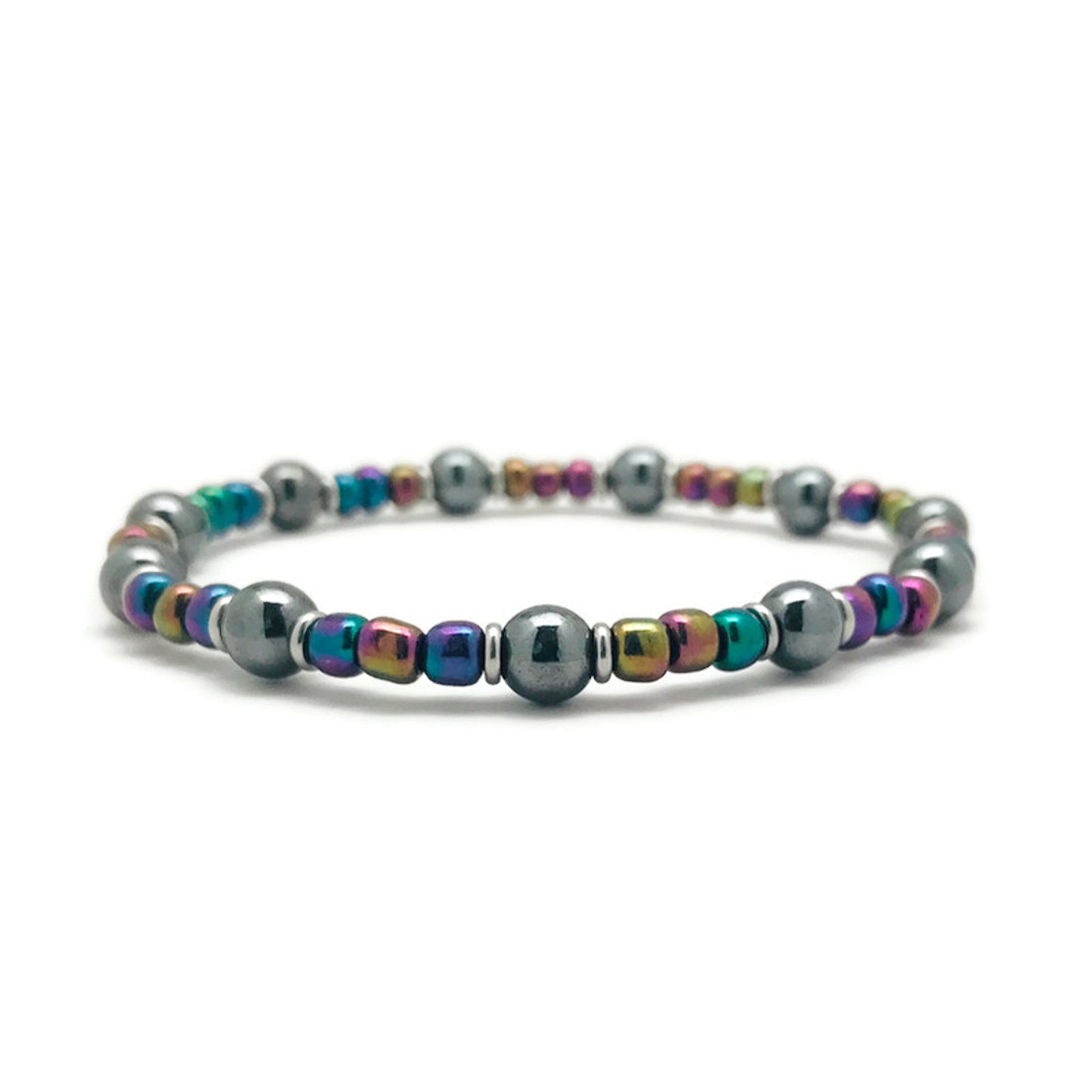 This metallic rainbow hematite beaded bracelet is a showstopper! It is crafted using non magnetic small natural hematite beads in beautiful metallic colors.  The larger beads are iridescent black which are complimented with small silver stainless steel discs. Hematite is a natural mineral known for its grounding properties. Some believe wearing it helps to calm your mind so you can focus on the day or tasks at hand. Since hematite is made from the earth, each bracelets color pattern will vary slightly. Your bracelet will ship in a classy teal satin pouch. Great for storage or ready to gift to a special man or woman in your life.