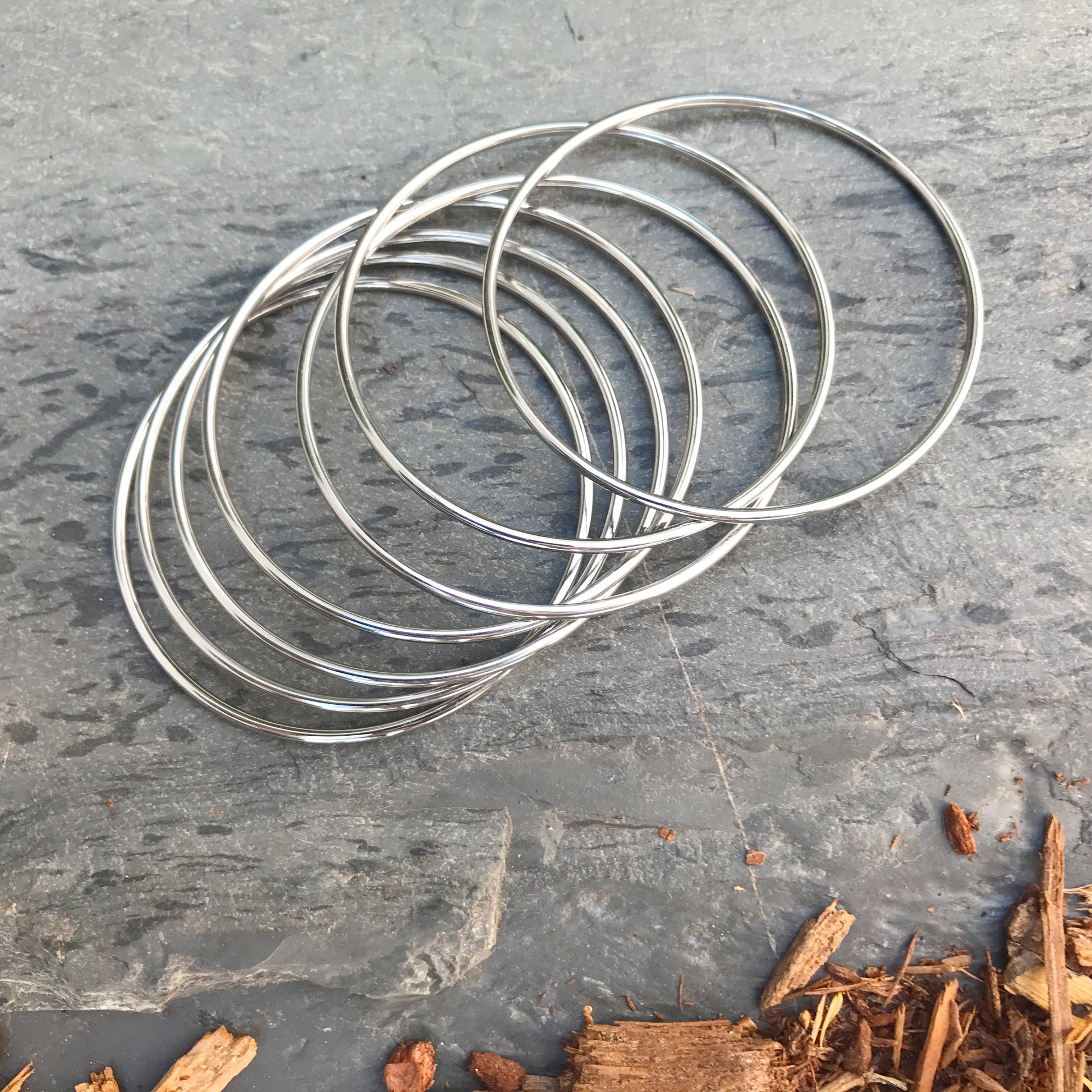 Finally, a set of thin silver stainless steel stacking bangle bracelets that will never tarnish! This versatile set features (7) individual 2mm plain round bangles that stack perfectly together. Choose from either an 8 inch or a 9 inch inner circumference.