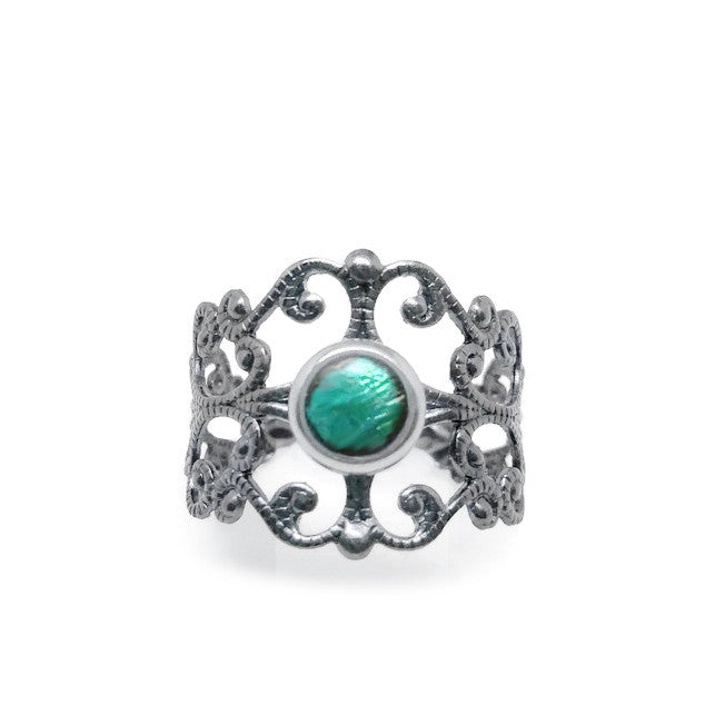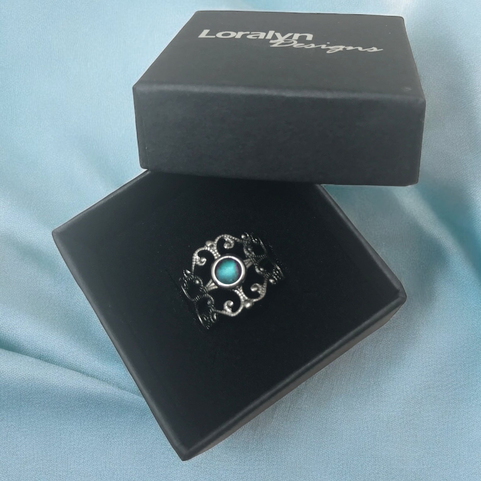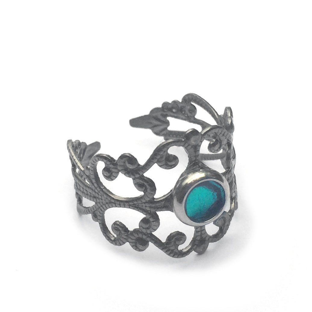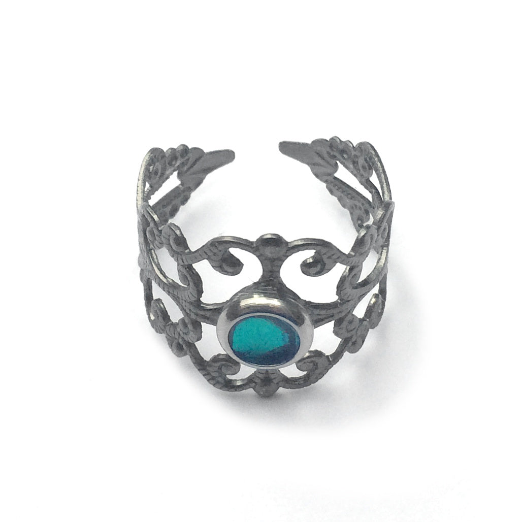 This unique gothic women's ring is crafted from a lightweight edgy filigree made from gunmetal coated brass. The center features a stunning metallic teal blue resin and black center framed in stainless steel. The widest part of the ring at the top measures 5/8" and tapers down to a rounded point at both ends. It is easily adjustable with a simple pinch or pull. Recommended for fingers with ring sizes between 7 and 9).