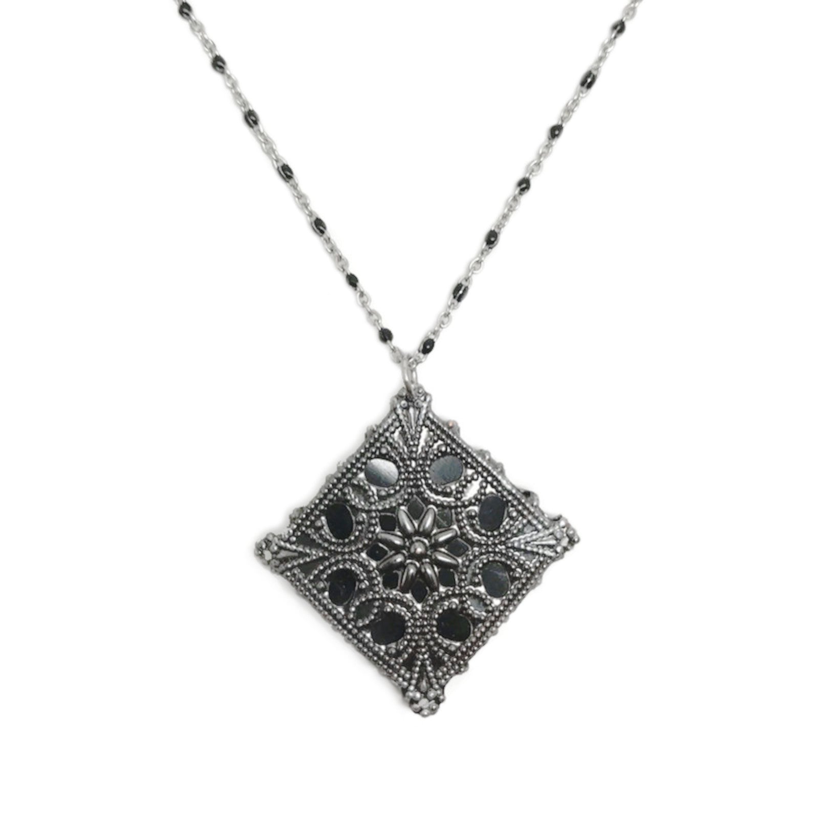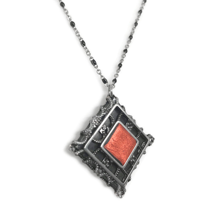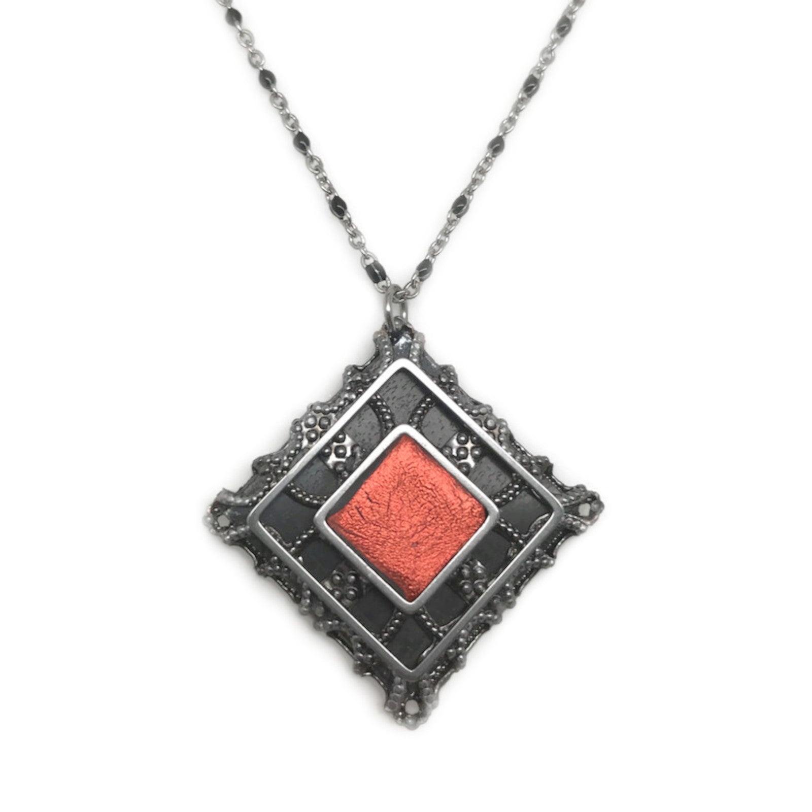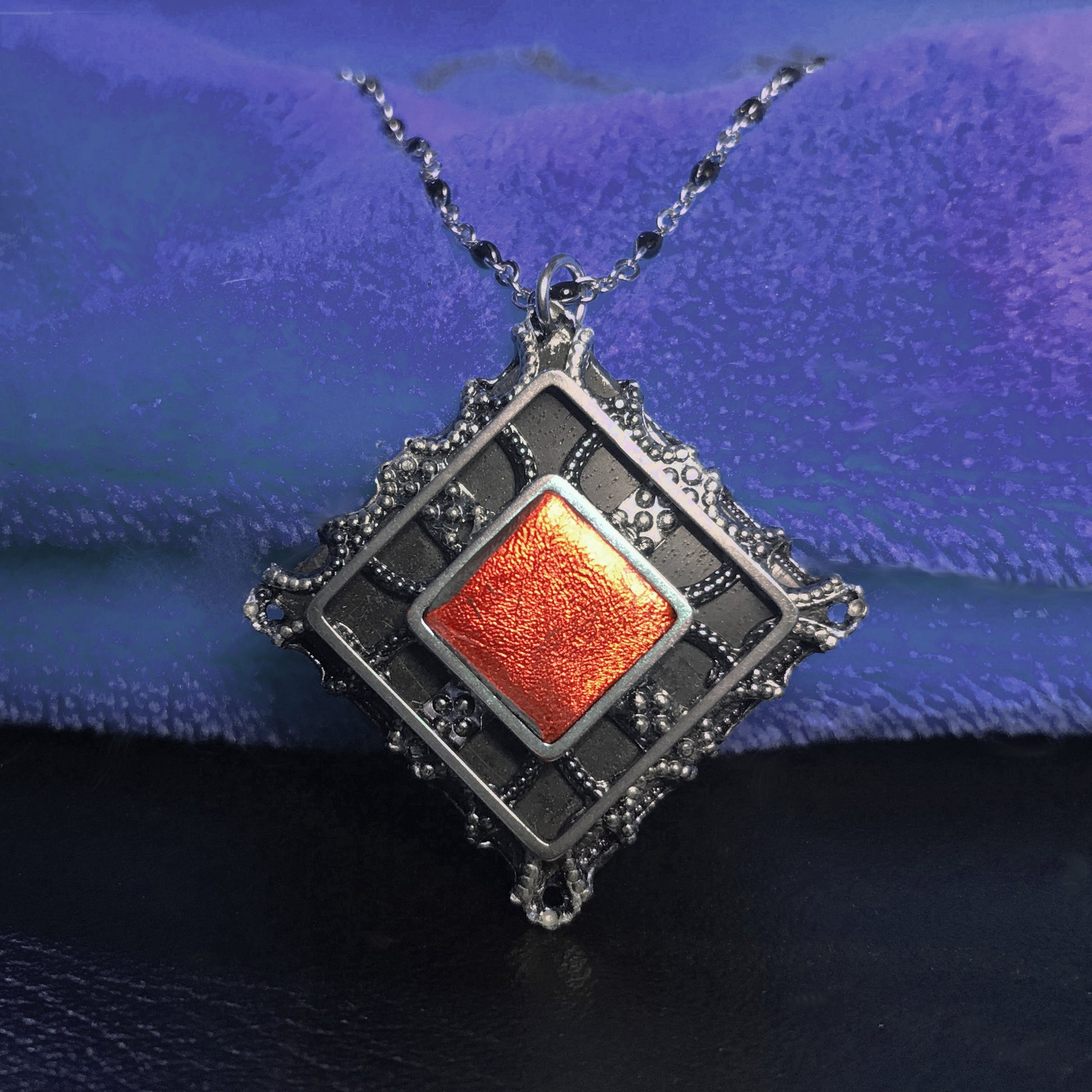 This handmade reversible diamond filigree pendant necklace puts a modern twist on old world Victorian jewelry.  Measuring 1 1/4 inches wide by 1 1/14 inches tall it is large enough to be a focal piece but small enough as not to overpower your ensemble.  One side features a swirling filigree pattern surrounding a small flower.  The other features a filigree pattern topped with stainless steel frames and a stunning hand molded metallic orange resin center.  We have over 20 colors you can choose from.  If you would like the center to be a different color than shown, please include a note at checkout with the color code (see chart 5th picture).  The pendant hangs from a stainless steel and black resin necklace chain with lobster clasp closure. Available in your choice of lengths from 16 to 20 inches.