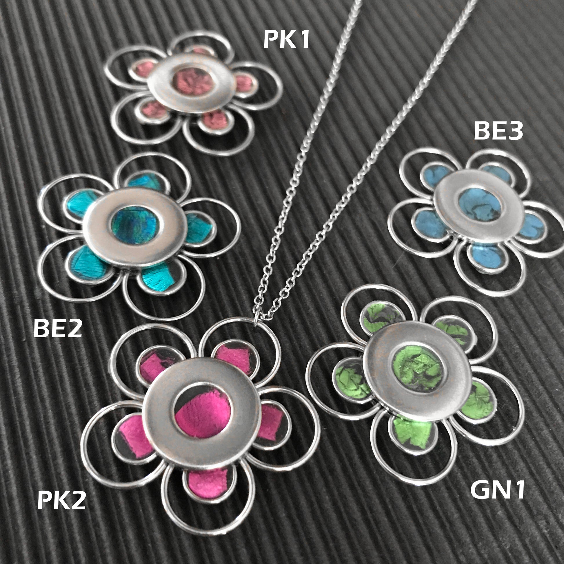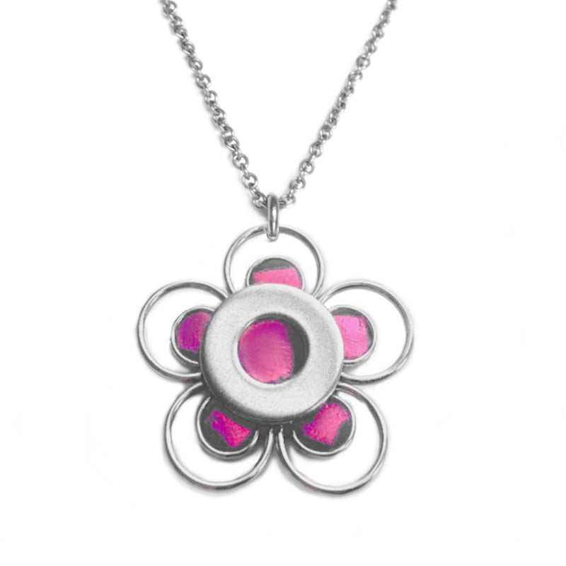 This silver, one-of-a-kind, stainless steel metal flower pendant is 1 1/4" in diameter, handmade, and features a metallic modeling resin that can be customized with over 20 available colors. To order with different center/petal colors, simply provide the code of your color choice(s) at checkout. Orders without color codes will receive a hot pink (PK2) flower (color shown). Made from stainless steel, this pendant is very durable, is waterproof and will never tarnish. Your pendant will ship on a stainless steel chain with lobster clasp closure in your choice of length from 16 to 24 inches.