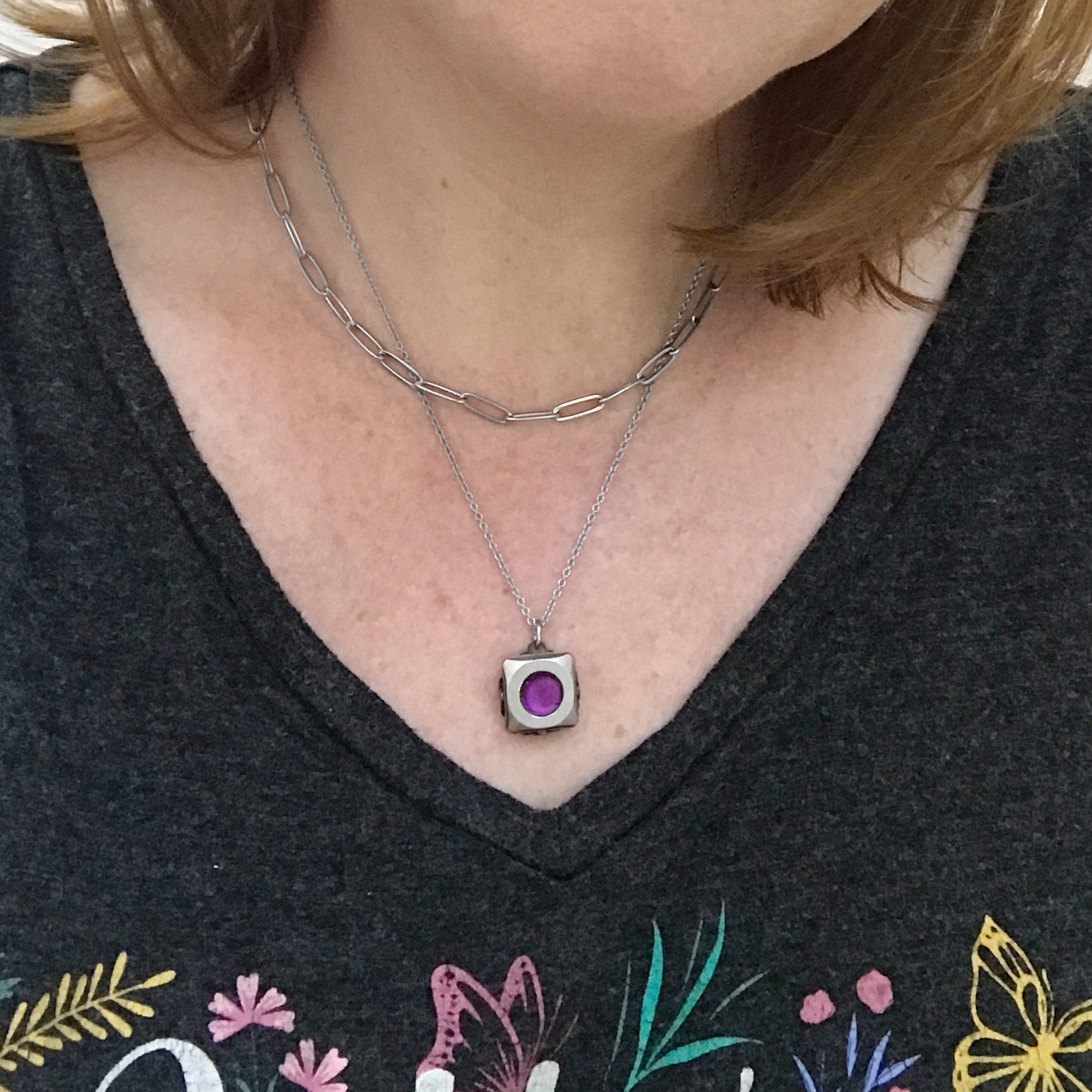 The pendant is shown on an 18" 1.6mm cable stainless steel necklace chain.  Is purple not your favorite color?  Design your own!  You can customize your necklace's chain length and center color.  Chose your length from the drop down menu.  Add the color code from the color chart (5th picture) in the notes section in your shopping cart.