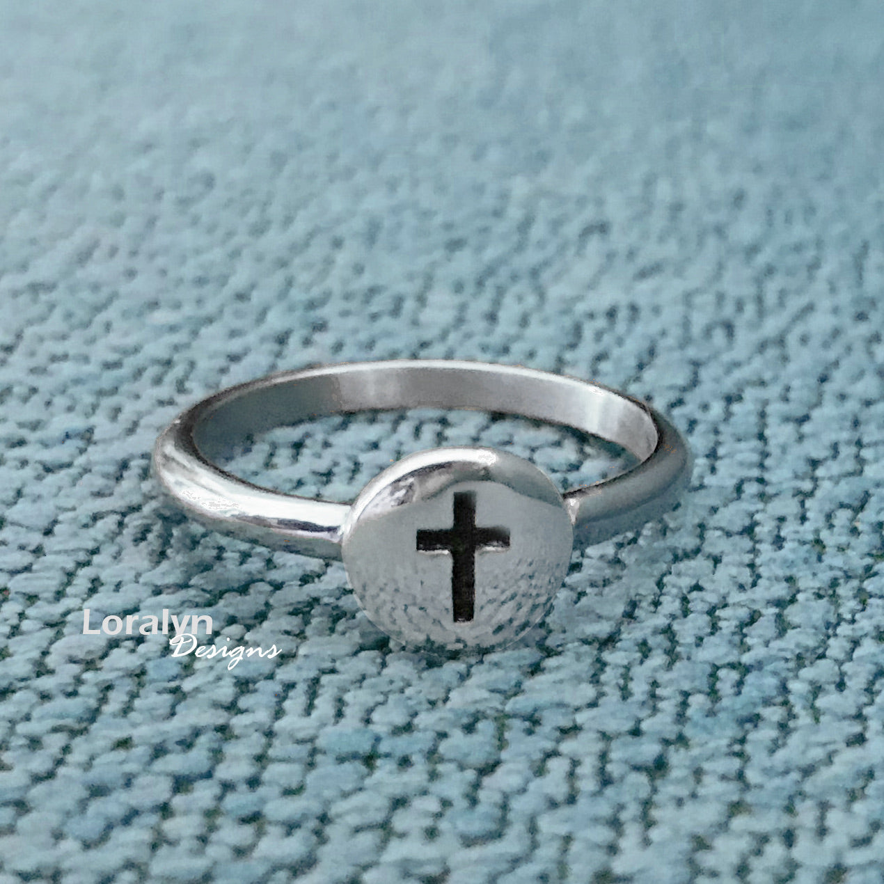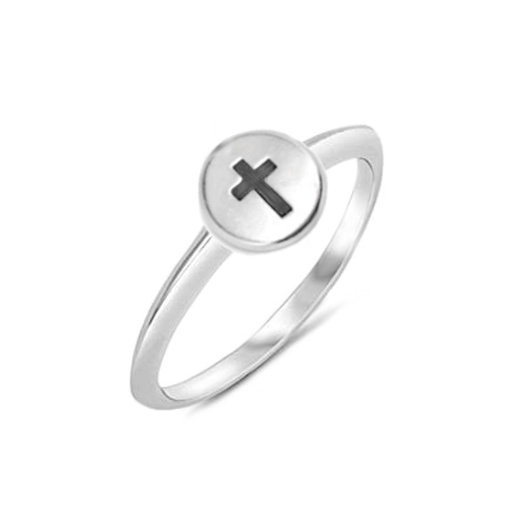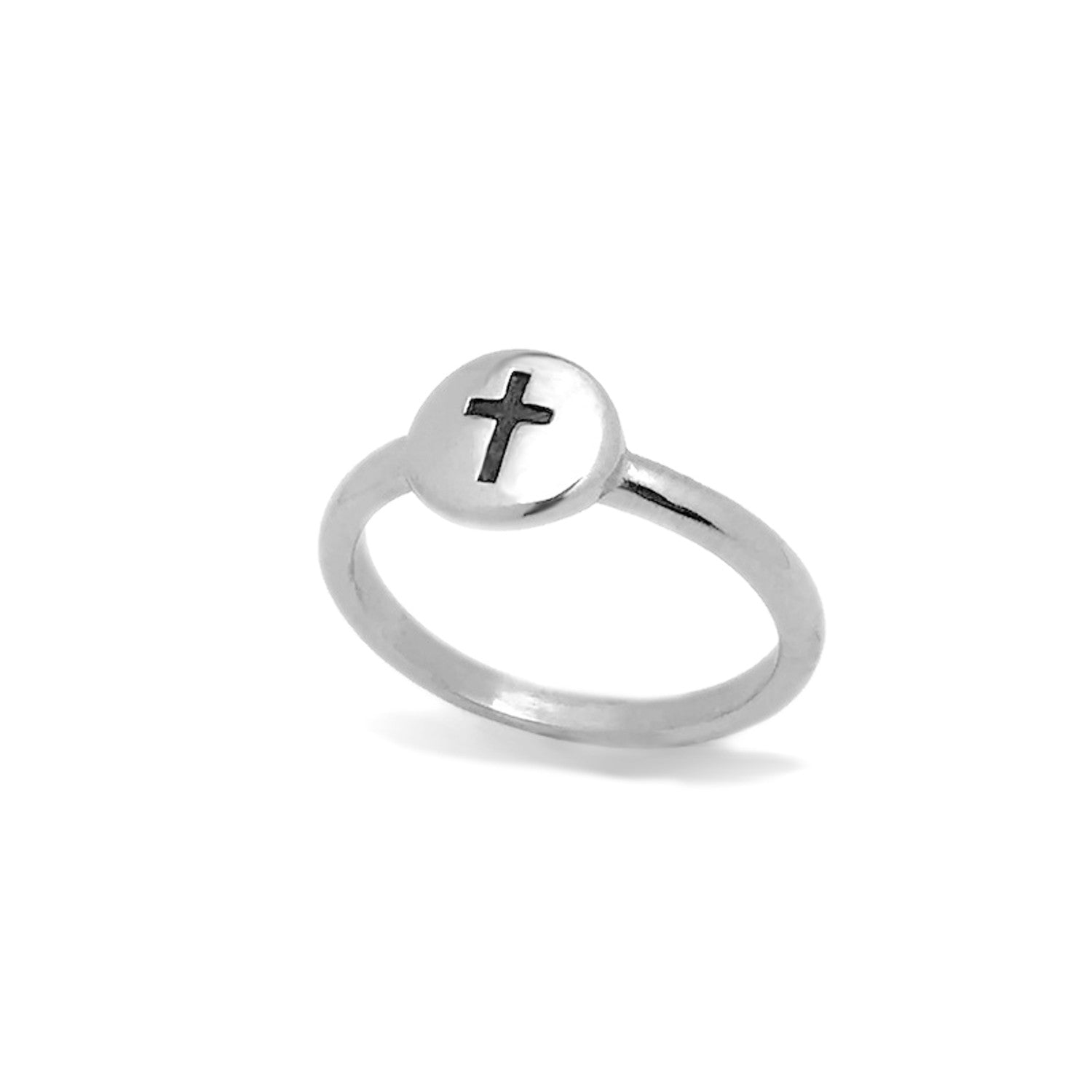 This simple, silver tone stainless steel womens cross ring features a small (8mm) disc with an engraved blackened cross on top of a 2mm ring ring band. Stainless steel jewelry will last a lifetime and beyond. Unlike silver, it will never tarnish or rust and it is not susceptible to scratches, dings or dents. Yes, you can wear this jewelry in the shower, bathing or swimming. Stainless is also great for people with skin sensitivities to other metals (won't turn your finger green).