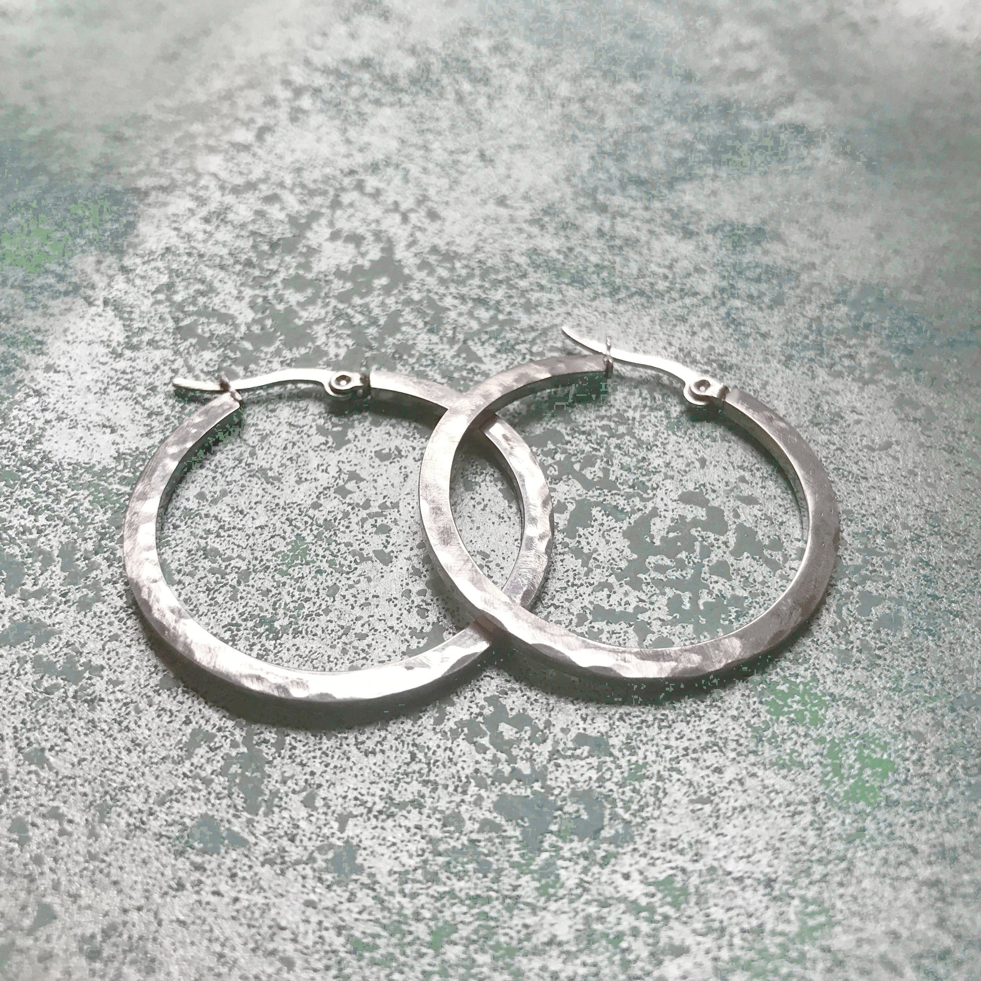 Crafted from durable 316L stainless steel, these medium-sized hand hammered hoop earrings are perfect for all occasions. Unlike sterling silver, they will NEVER TARNISH OR LOSE THEIR SHINE and are 100% waterproof. Stainless is also a great alternative for those with sensitive skin. Each polished hoop measures 1.4 inches in diameter (35mm) and closes securely with a hinge lock clasp. Bonus: these earrings come in a charming jewelry box with a soft black velvet lining - making them a fabulous gift for that special woman or teenage girl in your life!