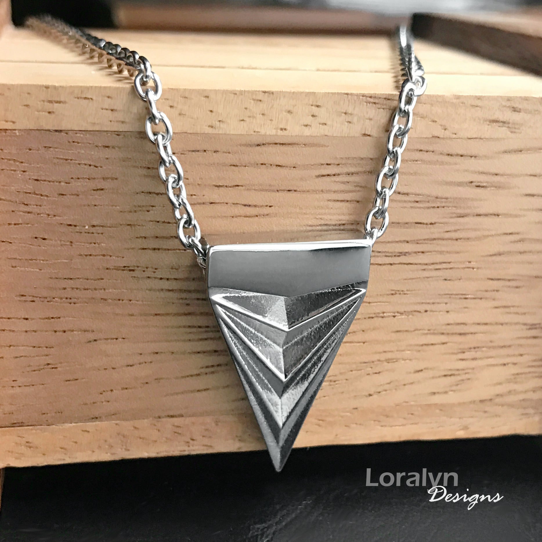 One of the oldest symbols, the triangle, has held numerous meanings by different cultures and civilizations over the centuries.  Balance, power, nature, love, and strength just to name a few.  Inspired by ancient arrowheads, this pendant was designed to highlight strength and power with its 4 triangles in varying depths and heights.  It is made from solid 316L stainless steel and polished to a mirror finish.  The tip is purposely rounded, not sharp so it will not catch on you or your clothes. Black style shown for size reference only on model is on 16 inch cord. This listing is for the silver color stainless steel version.